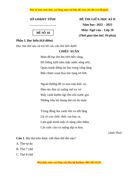 Môn: Ngữ văn – Lớp 10 ĐỀ SỐ 10