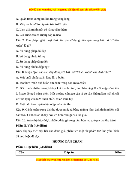 Câu 8. Nhận định nào sau đây đúng với bài thơ “Chiều xuân” của Anh Thơ?