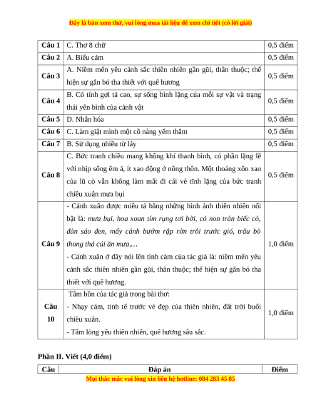 A. Niềm mến yêu cảnh sắc thiên nhiên gần gũi, thân thuộc; thể Câu 3 0,5 điểm