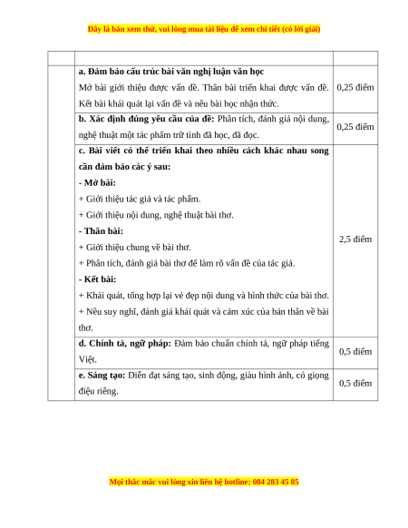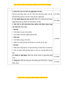 Anh/ chị hãy viết một bài văn đánh giá, phân tích một tác phẩm trữ tình yêu thích đã học hoặc đã đọc. HƯỚNG DẪN CHẤM