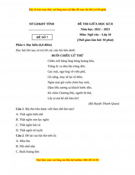 Môn: Ngữ văn – Lớp 10 ĐỀ SỐ 7