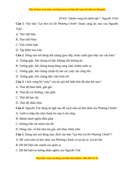 Câu 1. Văn bản “Lại thư trả lời Phương Chính” thuộc sáng tác nào của Nguyễn Trãi? A. Thơ chữ Hán B. Thơ chữ Nôm C. Văn chính luận D. Tập Môn hoa mộc