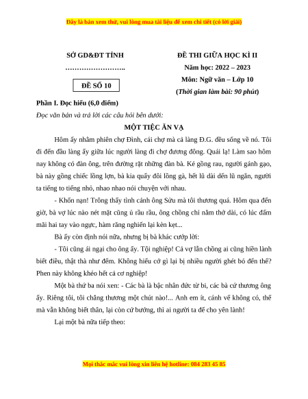 Môn: Ngữ văn – Lớp 10 ĐỀ SỐ 10