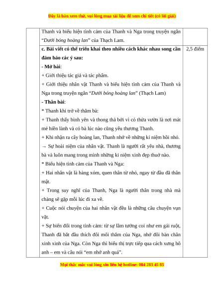 cảm của Thanh và Nga trong truyện ngắn “Dưới bóng hoàng lan” – Thạch Lam. HƯỚNG DẪN CHẤM