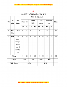 Mức độ nhận thức Kĩ Nội Thông Vận Vận dụng TT Nhận biết Tổng năng dung hiểu dụng cao TN TL TN TL TN TL TN TL 1 Đọc Truyện 0 1 0 2 0 1 0 50 hiểu 2 Viết Viết 0 1* 0 1* 0 1* 0 1* 50 đoạn văn ghi lại cảm xúc về một bài thơ Tổng 0 15 0 35 0 40 0 10 100 Tỉ lệ % 15% 35% 40% 10% Tỉ lệ chung 50% 50%