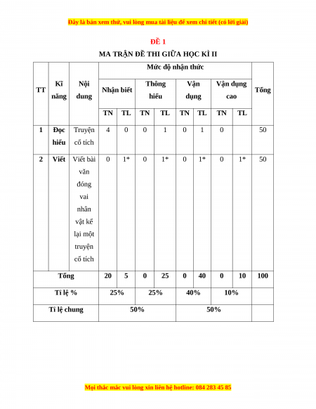 Mức độ nhận thức Kĩ Nội Thông Vận Vận dụng TT Nhận biết Tổng năng dung hiểu dụng cao TN TL TN TL TN TL TN TL 1 Đọc Truyện 4 0 0 1 0 1 0 50 hiểu cổ tích 2 Viết Viết bài 0 1* 0 1* 0 1* 0 1* 50 văn đóng vai nhân vật kể lại một truyện cổ tích Tổng 20 5 0 25 0 40 0 10 100 Tỉ lệ % 25% 25% 40% 10% Tỉ lệ chung 50% 50%