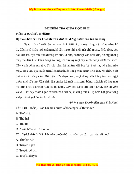 Câu 2 (0,5 điểm): Văn bản trên thuộc thể loại văn học dân gian nào đã học? A. Thơ lục bát B. Truyện ngắn C. Truyện cổ tích D. Truyền thuyết