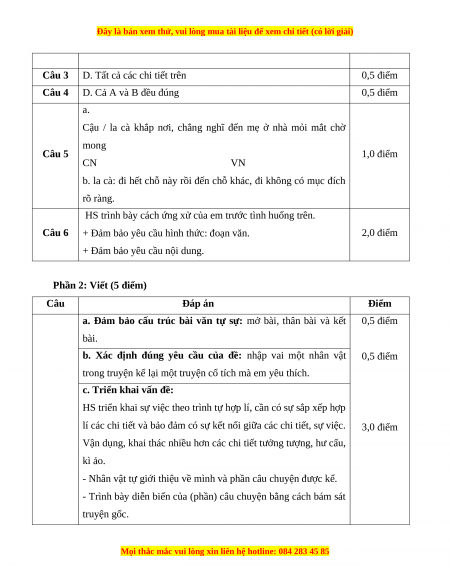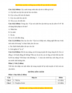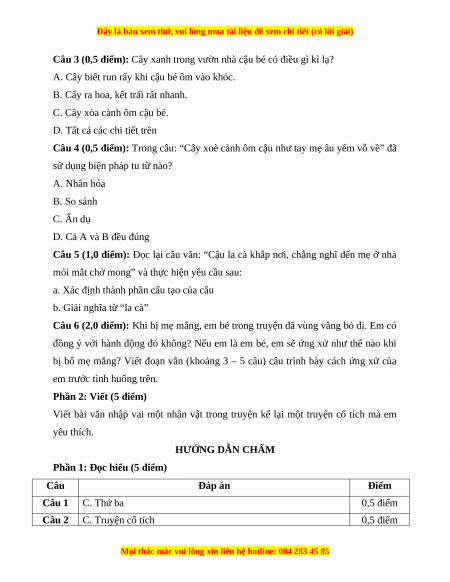 Phần 1: Đọc hiểu (5 điểm) Câu Đáp án Điểm Câu 1 C. Thứ ba 0,5 điểm Câu 2 C. Truyện cổ tích 0,5 điểm