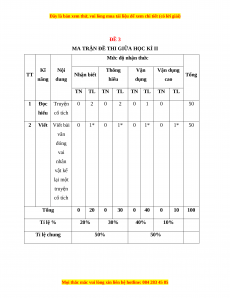 Mức độ nhận thức Kĩ Nội Thông Vận Vận dụng TT Nhận biết Tổng năng dung hiểu dụng cao TN TL TN TL TN TL TN TL 1 Đọc Truyện 0 2 0 2 0 1 0 50 hiểu cổ tích 2 Viết Viết bài 0 1* 0 1* 0 1* 0 1* 50 văn đóng vai nhân vật kể lại một truyện cổ tích Tổng 0 20 0 30 0 40 0 10 100 Tỉ lệ % 20% 30% 40% 10% Tỉ lệ chung 50% 50%