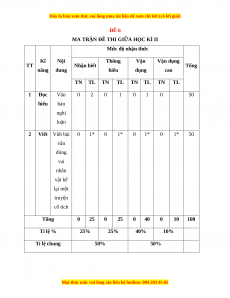 Mức độ nhận thức Kĩ Nội Thông Vận Vận dụng TT Nhận biết Tổng năng dung hiểu dụng cao TN TL TN TL TN TL TN TL 1 Đọc Văn 0 2 0 1 0 1 0 50 hiểu bản nghị luận 2 Viết Viết bài 0 1* 0 1* 0 1* 0 1* 50 văn đóng vai nhân vật kể lại một truyện cổ tích Tổng 0 25 0 25 0 40 0 10 100 Tỉ lệ % 25% 25% 40% 10% Tỉ lệ chung 50% 50%