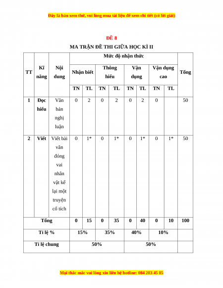 Mức độ nhận thức Kĩ Nội Thông Vận Vận dụng TT Nhận biết Tổng năng dung hiểu dụng cao TN TL TN TL TN TL TN TL 1 Đọc Văn 0 2 0 2 0 2 0 50 hiểu bản nghị luận 2 Viết Viết bài 0 1* 0 1* 0 1* 0 1* 50 văn đóng vai nhân vật kể lại một truyện cổ tích Tổng 0 15 0 35 0 40 0 10 100 Tỉ lệ % 15% 35% 40% 10% Tỉ lệ chung 50% 50%