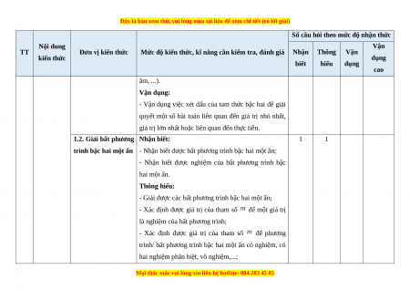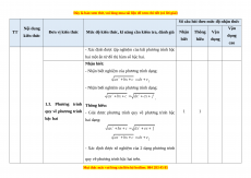 Đơn vị kiến thức tổng kiến thức Thời Thời Thời Thời gian Số Số Số Số điểm gian gian gian gian TN TL (phút) CH CH CH CH (phút) (phút) (phút) (phút) 1.1. Dấu của tam thức BẤT 2 2 1 2 1 10 3 1 bậc hai PHƯƠNG 1 TRÌNH 1.2. Giải bất phương 20 33,33 1 1 1 2 2 BẬC HAI trình bậc hai một ẩn 1.3. Phương trình quy MỘT ẨN 1 1 1 2 2 về phương trình bậc hai PHƯƠNG 2.1. Tọa độ của vectơ 2 2 2 4 4