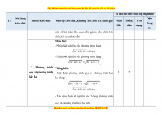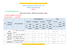 Đơn vị kiến thức tổng kiến thức Thời Thời Thời Thời gian Số Số Số Số điểm gian gian gian gian TN TL (phút) CH CH CH CH (phút) (phút) (phút) (phút) 1.1. Dấu của tam thức BẤT 3 3 2 4 5 1 bậc hai PHƯƠNG 1 TRÌNH 1.2. Giải bất phương 30 36 3 3 2 4 1 10 5 BẬC HAI trình bậc hai một ẩn 1.3. Phương trình quy MỘT ẨN 1 1 2 5 3 về phương trình bậc hai PHƯƠNG 2.1. Tọa độ của vectơ 4 5 2 5 6