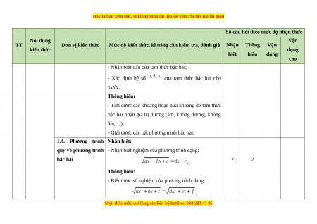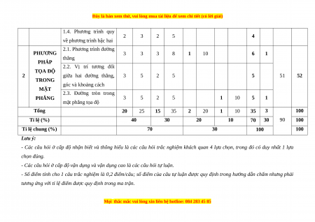 1.4. Phương trình quy 2 3 2 5 4 về phương trình bậc hai 2.1. Phương trình đường PHƯƠNG 3 3 3 8 1 10 6 1 thẳng PHÁP 2.2. Vị trí tương đối TỌA ĐỘ 2 giữa hai đường thẳng, 3 5 2 5 5 51 52 TRONG góc và khoảng cách MẶT 2.3. Đường tròn trong PHẲNG 3 5 2 5 1 10 5 1 mặt phẳng tọa độ Tổng 20 25 15 35 2 20 1 10 35 3 100 Tỉ lệ (%) 40 30 20 10 70 30 90 100 Tỉ lệ chung (%) 70 30 100 100 Lưu ý:
