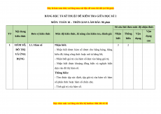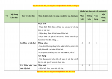 Đơn vị kiến thức tổng kiến thức Thời Thời Thời Thời gian Số Số Số Số điểm gian gian gian gian TN TL (phút) CH CH CH CH (phút) (phút) (phút) (phút) 1 HÀM SỐ, 1.1. Hàm số 3 3 2 4 5 ĐỒ THỊ VÀ 1.2. Hàm số bậc hai 3 3 2 4 1 10 5 1 39 48 ỨNG 1.3. Dấu của tam thức 3 3 2 4 5 DỤNG bậc hai