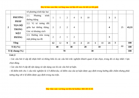 về phương trình bậc hai 2.1. Phương trình PHƯƠNG 1 1 2 4 1 10 3 1 đường thẳng PHÁP 2.2. Vị trí tương đối TỌA ĐỘ 2 giữa hai đường thẳng. 2 2 2 4 4 25 43,33 TRONG Góc và khoảng cách MẶT 2.3. Đường tròn trong PHẲNG 2 2 1 2 3 mặt phẳng tọa độ Tổng 12 12 9 18 2 20 1 10 21 3 100 60 Tỉ lệ (%) 40 30 20 10 100 Tỉ lệ chung (%) 70 30 100 Lưu ý: