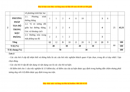 về phương trình bậc hai 2.1. Phương trình PHƯƠNG 1 1 2 4 1 10 3 1 đường thẳng PHÁP 2.2. Vị trí tương đối TỌA ĐỘ 2 giữa hai đường thẳng. 2 2 2 4 4 25 43,33 TRONG Góc và khoảng cách MẶT 2.3. Đường tròn trong PHẲNG 2 2 1 2 3 mặt phẳng tọa độ Tổng 12 12 9 18 2 20 1 10 21 3 100 60 Tỉ lệ (%) 40 30 20 10 100 Tỉ lệ chung (%) 70 30 100 Lưu ý: