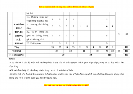 bậc hai 1.4. Phương trình quy 2 3 2 5 4 về phương trình bậc hai PHƯƠNG 2.1. Phương trình đường 3 3 3 8 1 10 6 1 PHÁP thẳng TỌA ĐỘ 2.2. Vị trí tương đối 2 41 42 TRONG giữa hai đường thẳng, 3 5 2 5 5 MẶT góc và khoảng cách PHẲNG 2.3. Đường tròn 3 5 2 5 5 Tổng 20 25 15 35 2 20 1 10 35 3 100 Tỉ lệ (%) 40 30 20 10 70 30 90 100 Tỉ lệ chung (%) 70 30 100 100 Lưu ý: