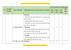 Đơn vị kiến thức tổng kiến thức Thời Thời Thời Thời gian Số Số Số Số điểm gian gian gian gian TN TL (phút) CH CH CH CH (phút) (phút) (phút) (phút) HÀM SỐ, 1.1. Hàm số 3 3 2 4 5 ĐỒ THỊ VÀ 1 ỨNG 1.2. Hàm số bậc hai 3 3 2 4 1 10 5 1 DỤNG 49 58 1.3. Dấu của tam thức 3 3 2 4 1 10 5 1
