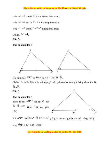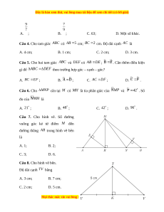 theo trường hợp góc – cạnh – góc? A. ; B. ; C. ; D. . Câu 6. Cho cân tại có là tia phân giác của và . Số đo của là A. ; B. ; C. ; D. .