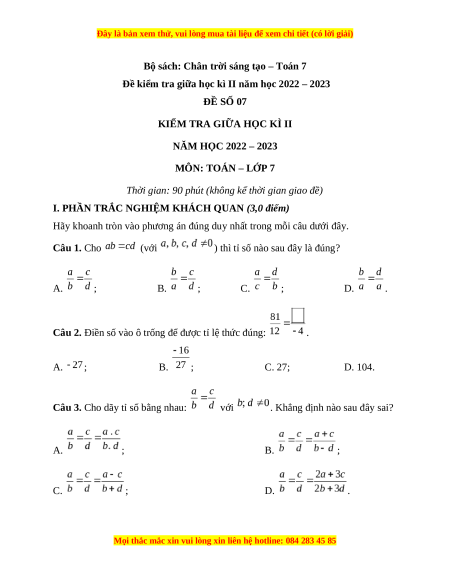 Đề kiểm tra giữa học kì II năm học 2022 – 2023 ĐỀ SỐ 07