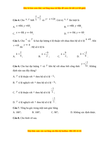 Câu 5. Cho và là hai đại lượng tỉ lệ thuận với nhau theo hệ số tỉ lệ . Khi thì . Hệ số tỉ lệ là A. ; B. ; C. ; D. .