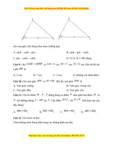 Hai tam giác trên bằng nhau theo trường hợp A. cạnh – cạnh – góc; B. cạnh – góc – cạnh; C. góc – cạnh – cạnh; D. Cả A, B, C đều đúng. Câu 9. Cho có cm, cm, cm. Khi đó độ dài cạnh là A. 5 cm; B. 7 cm; C. 3 cm;
