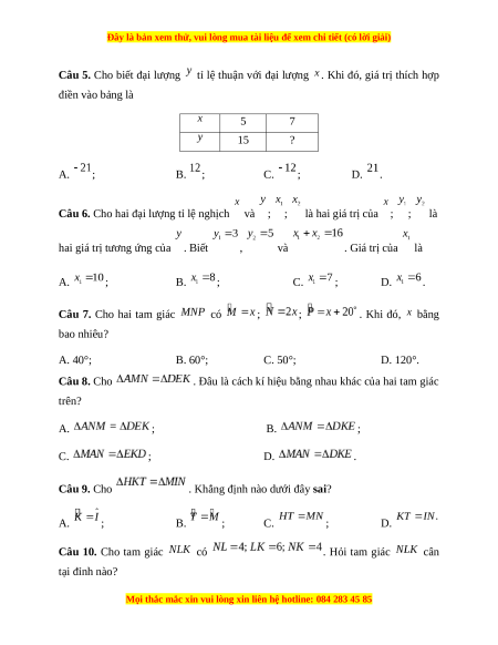 Câu 5. Cho biết đại lượng tỉ lệ thuận với đại lượng . Khi đó, giá trị thích hợp điền vào bảng là 5 7 15 ? A. ; B. ; C. ; D. .