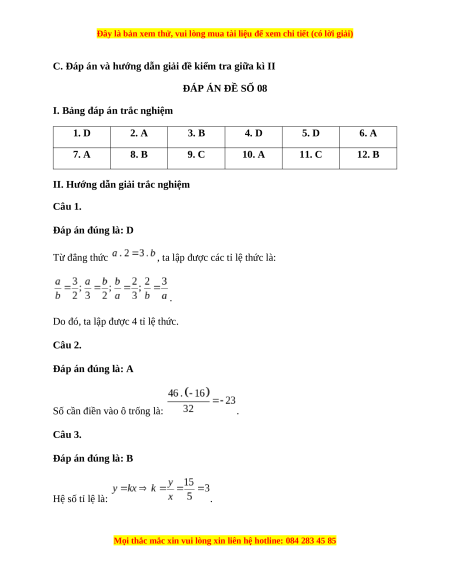 Câu 3. Với dãy tỉ số bằng nhau ta có thể viết: A. ; B. ; C. ; D. . Câu 4. Cho biết và . Giá trị lần lượt là A. ; B. ; C. ; D. .