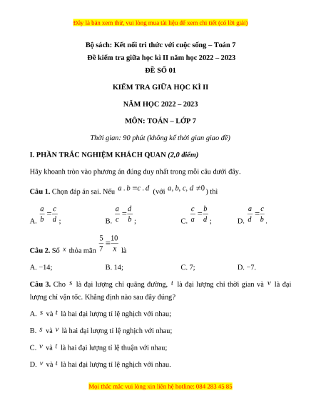 Đề kiểm tra giữa học kì II năm học 2022 – 2023 ĐỀ SỐ 01