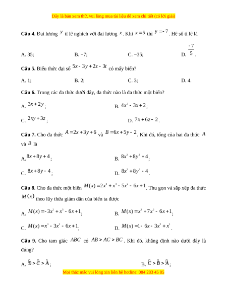 Câu 6. Trong các đa thức dưới đây, đa thức nào là đa thức một biến? A. ; B. ; C. ; D. . Câu 7. Cho đa thức và