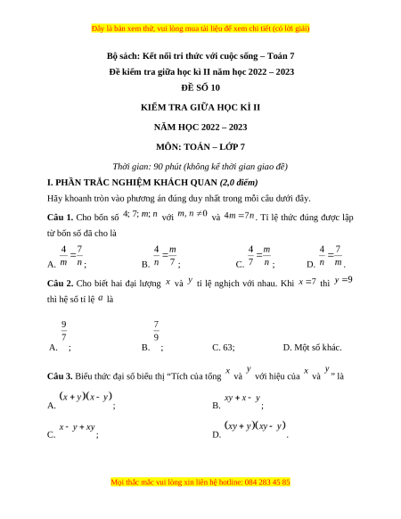 Đề kiểm tra giữa học kì II năm học 2022 – 2023 ĐỀ SỐ 10