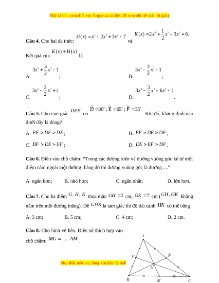 Câu 4. Cho hai đa thức: và Kết quả của là A. ; B. ; C. ; D. . Câu 5. Cho tam giác có
