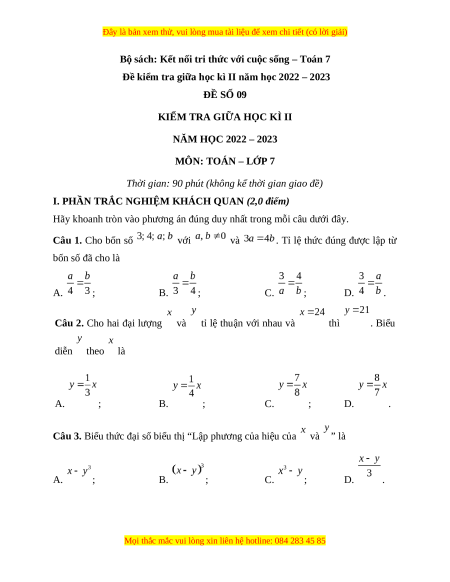 Đề kiểm tra giữa học kì II năm học 2022 – 2023 ĐỀ SỐ 09