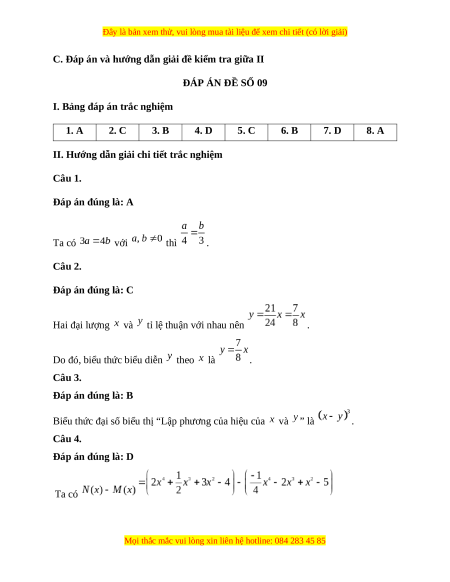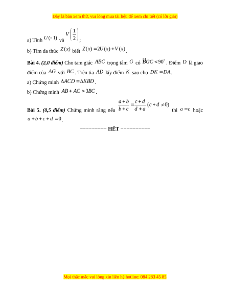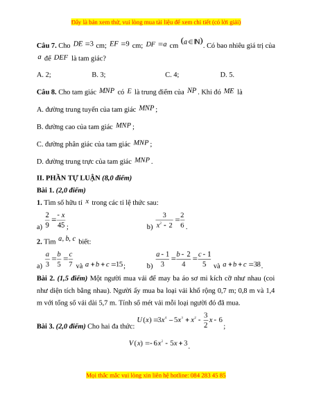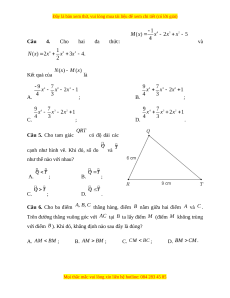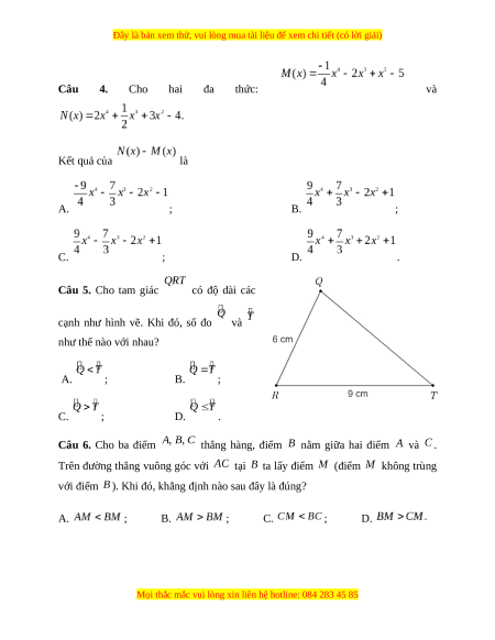 Đây là bản xem thử, vui lòng mua tài liệu để xem chi tiết (có lời giải) Câu 4. Cho hai đa thức: và Kết quả của là A. ; B. ; C. ; D. . Câu 5. Cho tam giác có độ dài các