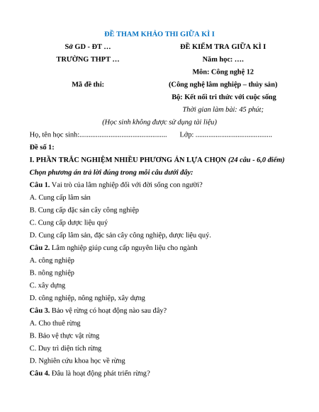 ĐỀ KIỂM TRA GIỮA KÌ I TRƯỜNG THPT … Năm học: …. Môn: Công nghệ 12 Mã đề thi: