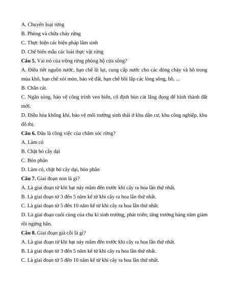 Câu 6. Đâu là công việc của chăm sóc rừng? A. Làm cỏ B. Chặt bỏ cây dại C. Bón phân