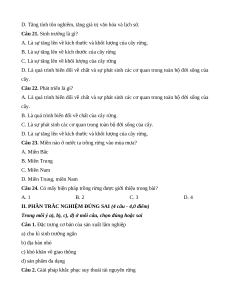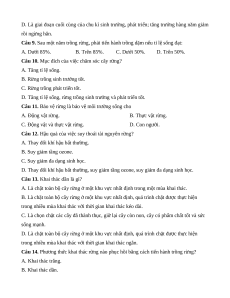 Câu 9. Sau một năm trồng rừng, phải tiến hành trồng dặm nếu tỉ lệ sống đạt: A. Dưới 85%. B. Trên 85%. C. Dưới 50%. D. Trên 50%.