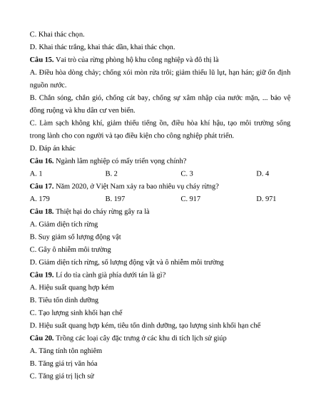 Câu 17. Năm 2020, ở Việt Nam xảy ra bao nhiêu vụ cháy rừng? A. 179 B. 197 C. 917 D. 971