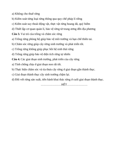 Câu 14. Phương thức khai thác rừng nào phục hồi bằng cách tiến hành trồng rừng? A. Khai thác trắng. B. Khai thác dần. C. Khai thác chọn.
