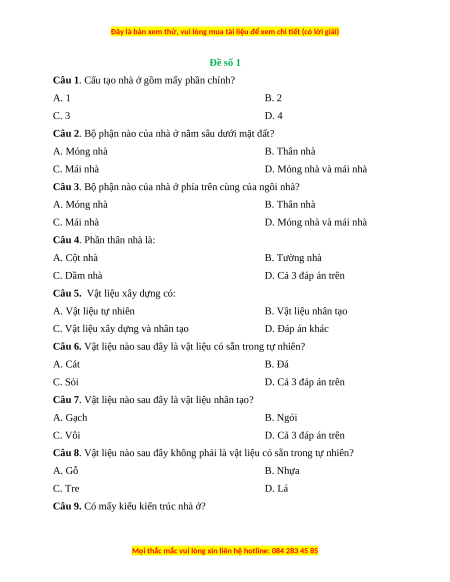 Câu 5. Vật liệu xây dựng có: A. Vật liệu tự nhiên B. Vật liệu nhân tạo