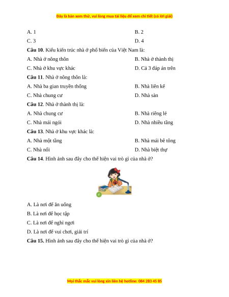 Câu 10. Kiểu kiến trúc nhà ở phổ biến của Việt Nam là: A. Nhà ở nông thôn B. Nhà ở thành thị C. Nhà ở khu vực khác D. Cả 3 đáp án trên