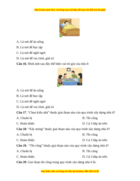 Câu 16. Hình ảnh sau đây thể hiện vai trò già của nhà ở: A. Là nơi để ăn uống B. Là nơi để học tập C. Là nơi để nghỉ ngơi