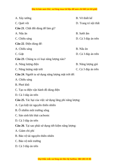 Câu 21. Chất đốt dùng để làm gì? A. Nấu ăn B. Sưởi ấm C. Chiếu sáng D. Cả 3 đáp án trên