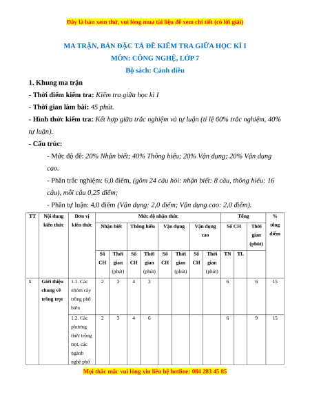 - Tailieugiaovien.com.vn giới thiệu bộ đề giữa kì 1 gồm đầy đủ ma trận và lời giải chi tiết môn Công ngệ 7 Cánh diều mới nhất năm 2024 nhằm giúp Giáo viên có thêm tài liệu tham khảo ra đề thi Công nghệ lớp 7.