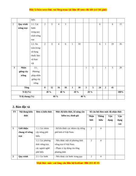 biến 2 Quy trình 2.1. Các 2 3 4 3 6 6 15 trồng trọt bước trong quy trình trồng trọt 2.2. An 2 3 4 6 1 10 6 1 19 35 toàn trong sử dụng thuốc bảo vệ thực vật 3 Nhân 3.1. 1 5 1 5 20 giống cây Phương trồng pháp nhân giống cây trồng Tổng 8 12 16 18 1 10 1 5 24 2 45 Tỉ lệ (%) 20 % 40 % 20 % 20 % 100% Tỉ lệ chung (%) 60 % 40 % 2. Bản đặc tả TT Nội dung kiến