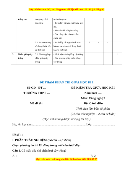 ĐỀ KIỂM TRA GIỮA HỌC KÌ I TRƯỜNG THPT … Năm học: …. Môn: Công nghệ 7 Mã đề thi: Bộ: Cánh diều