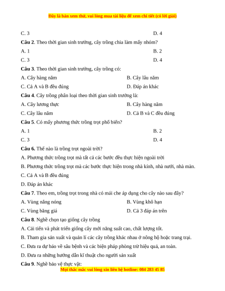 Câu 5. Có mấy phương thức trồng trọt phổ biến? A. 1 B. 2 C. 3 D. 4