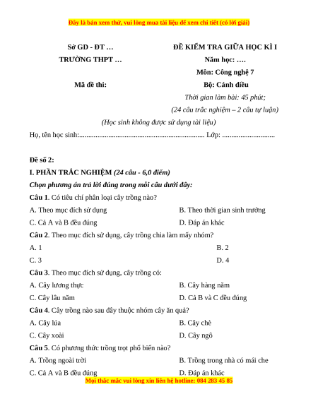 ĐỀ KIỂM TRA GIỮA HỌC KÌ I TRƯỜNG THPT … Năm học: …. Môn: Công nghệ 7 Mã đề thi: Bộ: Cánh diều