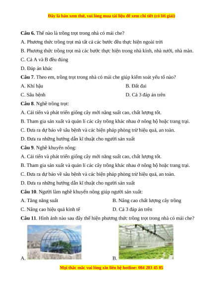 Câu 5. Có phương thức trồng trọt phổ biến nào? A. Trồng ngoài trời
